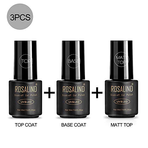 ROSALIND Base y Top Coat y Matte Top Coat Semipermentes, Esmaltes Semipermanentes de Uñas en Gel UV LED Gel Soak Off 3PCS/set 7ML