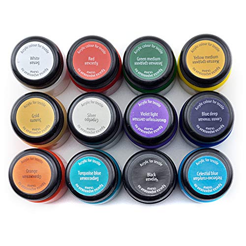 - PALETA DE COLORES COMPLETA de pintura textil permanente 12x20 ml: Negro, Blanco, Amarillo, Rojo, Verde, Azul claro, Azul profundo, Turquesa, Violeta, Rosa, Oro y Plata- Estos Acrílicos a base de agua pueden ser mezclados fácilmente entre sí o con agua para crear diferentes tonos e intensidades