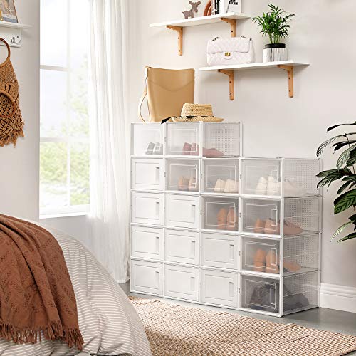 SONGMICS Cajas de Zapatos, Juego de 18 Organizadores de Plástico para Almacenamiento de Zapatos, Apilables y Plegables, hasta Talla 44, 9 Cubos Transparentes y 9 Cubos Blancos LSP009W01