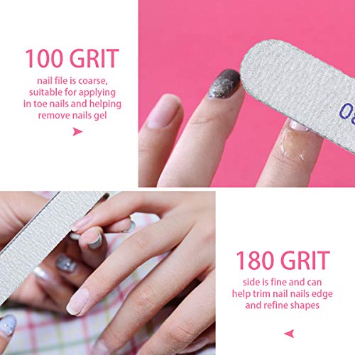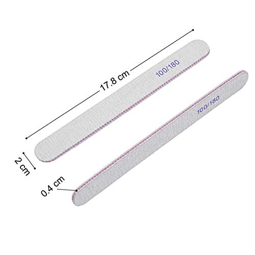 - ăLIMAS DE DOBLE CARAăEstas limas de uñas son de doble cara, los dos lados tienen diferentes granos. Un lado es de grano 100, adecuado para dar forma y peinar las uñas; el otro lado es de grano 180, que se utiliza para pulir el sello de gel.