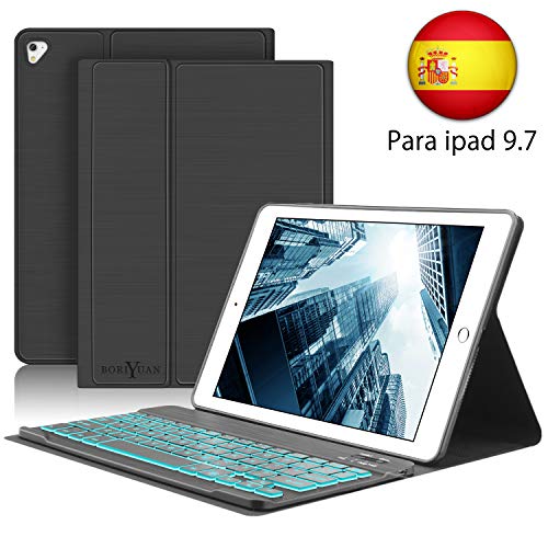 Boriyuan Funda teclado iPad 9.7,Funda con teclado español cuero para iPad 9.7 2018 6th/2017 5th iPad Pro 9.7/iPad Air 2/Air 1,con Bluetooth Inalámbrico 7 colores backlit Teclado para iPad 9.7 pulgadas