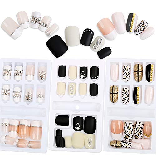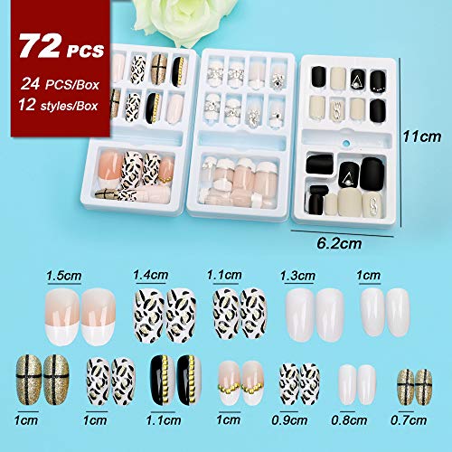 - ?Contenido: 3 cajas de uƱas postizas artificilaes: cada caje incluye 24pcs tips uƱas puntas de tamaƱo diferente, 1pcs gel de limpieza, 1pcs palillo de uƱas, 1 hojas de adhesivo de uƱas postizas y 1pcs lima de uƱas falsas