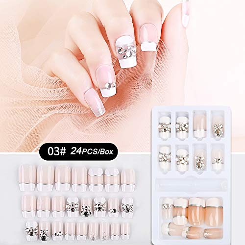 24pcs Uñas postizas, Uñas Falsa Artificial, Cortas, Estilo Francesa, con Pegamento, para Decoración del Arte del Uñas