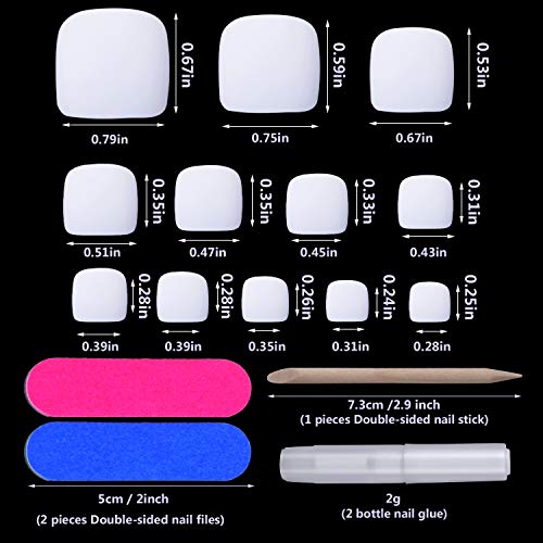 - Contenido del paquete: 72 piezas de uƱas de pies falsas cuadradas cortas y mate en 12 tamaƱos diferentes totalmente, 3 piezas de mini limas para uƱas, 3 piezas de palitos de madera, 3 piezas de pegamento para uƱas, cantidad suficiente y herramientas para satisfacer sus necesidades diarias