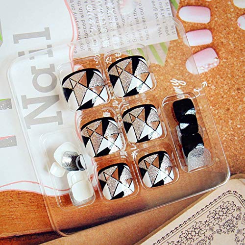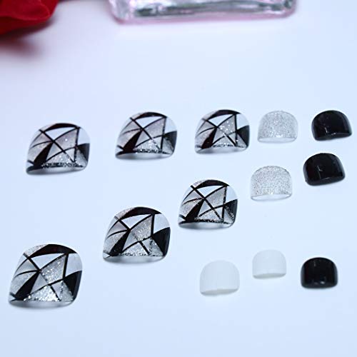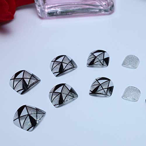 Yienate - UƱas postizas para dedos de los pies, elegante, exquisita nupcial en blanco y negro, triƔngulo geomƩtrico plateado para dedos de los pies, puntas de uƱas de pie, 24 unidades