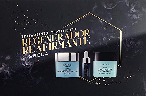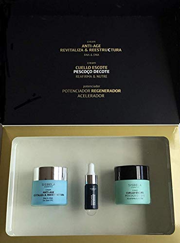 - Set de regalo de productos Sisbela que incluye un Serum Potenciador regenerador acelerador 10 ml, una crema facial anti- edad revitalizante y reestructuradora 50 ml y una crema reafirmante para cuello y escote 50 ml