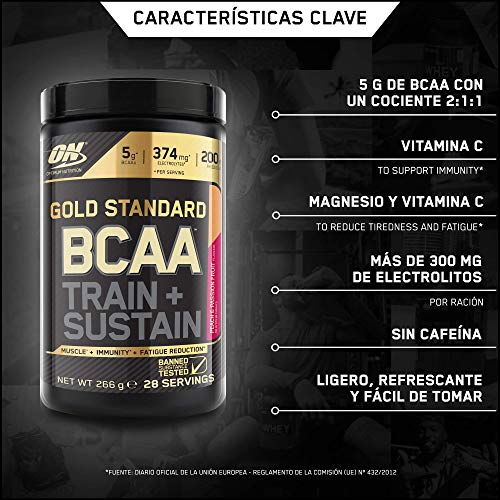 Optimum Nutrition Gold Standard BCAA Polvo, Suplementos Deportivos con Aminoacidos, Vitamina C, Zinc, Magnesio y Electrolitos, Melocotón y Fruta de la Pasión, 28 Porciones, 266g, Embalaje Puede Variar