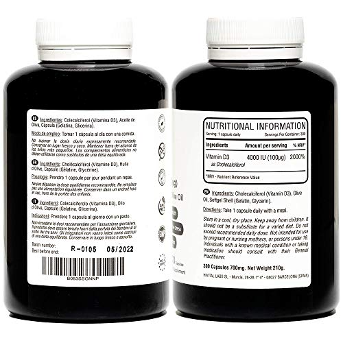 - ❤️ LA MEJOR VITAMINA D3: Cada cápsula blanda contiene 4000 UI (100 mcg) de la mejor Vitamina D3 Colecalciferol disuelta en Aceite de Oliva Virgen Extra. Nuestro producto garantiza una óptima absorción y eficacia. Si tienes déficit severo de D3 (niveles por debajo de los 20 ng/ml), con una cápsula al día lo solucionarás. Si no tienes déficit pero necesitas elevar los niveles tomando una cápsula cada 5 días es suficiente.
