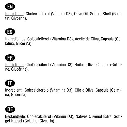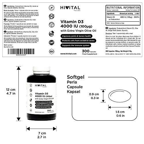 - ? EXCELENTE FÓRMULA a base de Vitamina D3 pura en su forma Colecalciferol y Aceite de Oliva Virgen Extra | La Vitamina D mantiene los huesos, las articulaciones y los dientes sanos, mejora la función muscular y el sistema inmunológico, y contribuye a la absorción normal de Calcio y Fósforo | GRAN CANTIDAD DE PRODUCTO AL MEJOR PRECIO: Ofrecemos 300 perlas por bote, suministro para 10 meses.