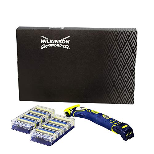 - Wilkinson hydro 5 groomer es la única herramienta de estilo 4 en 1 que recorta, afeita, bordea e hidratado a lo largo de cada afeitado