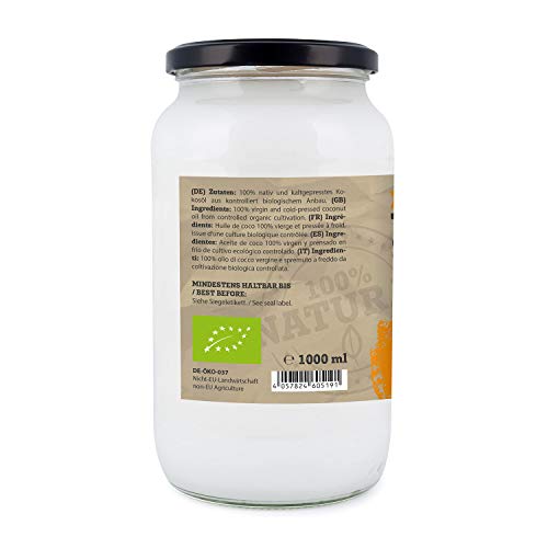 Aceite de Coco Ecológico Extra Virgen 1000 ml. Crudo y prensado en frío. 100% Orgánico, Puro y Natural. Aceite bio nativo no refinado. País de origen Sri Lanka. NaturaleBio