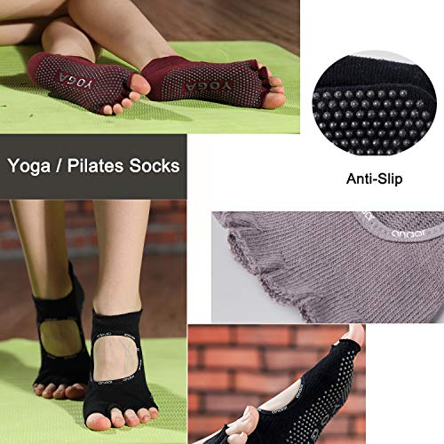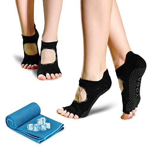 unisoul Calcetines Yoga Antideslizantes Mujer,2 Pares Calcetines de Yoga Pilates Y 1 Toalla Refrescantepara,para Yoga Pilates, Barra, Ballet, Fitness,Entrenamiento Descalzo,Sin Dedos