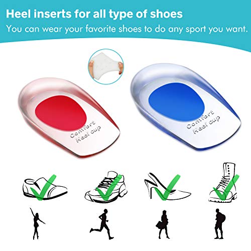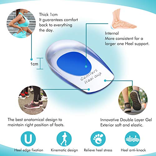 - 【ALIVIO INMEDIATO DEL DOLOR】Estas almohadillas de gel en forma de talón brindan un soporte poderoso para el talón y el tobillo, reduciendo el dolor, la fatiga y la hinchazón. Alivia el dolor en el pie causado por los espolones del talón, los espolones óseos y la fascitis plantar al absorber el choque y reducir la tensión y el estrés con cada paso.