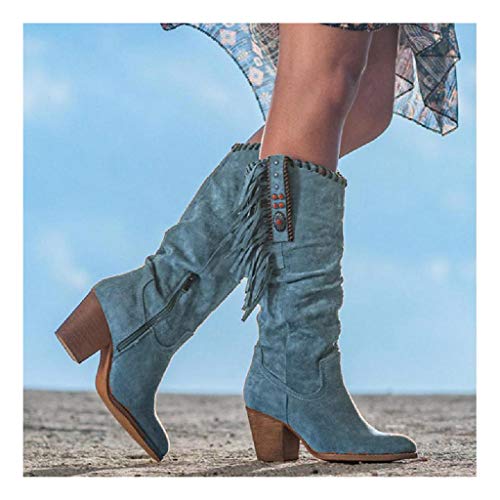 Botas De Mujer Estilo Vaquero Occidental Botas Altas con Flecos Tacón Alto Botas Largas De Otoño E Invierno Pliegues Vintage Zapatos Ecuestres De Gran Tamaño,Blue-37