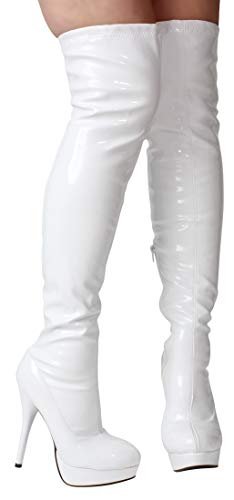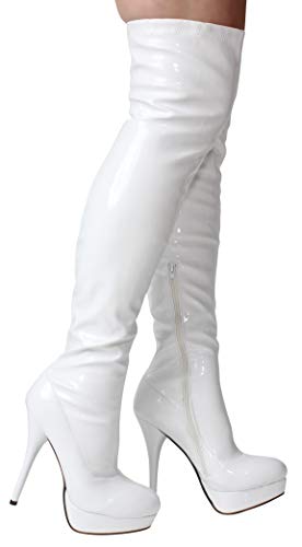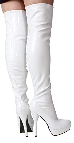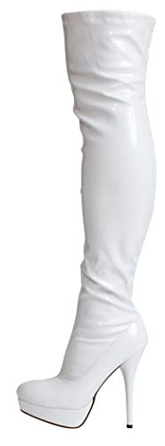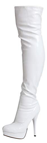 Nueva Sexy Rizado Fetiche Señoras Negro Blanco Rosa Rojo Muslo Encima de la Rodilla Altas Botas de Plataforma de Tacón (37 EU, Piel Sintética Blanco)
