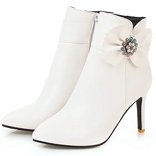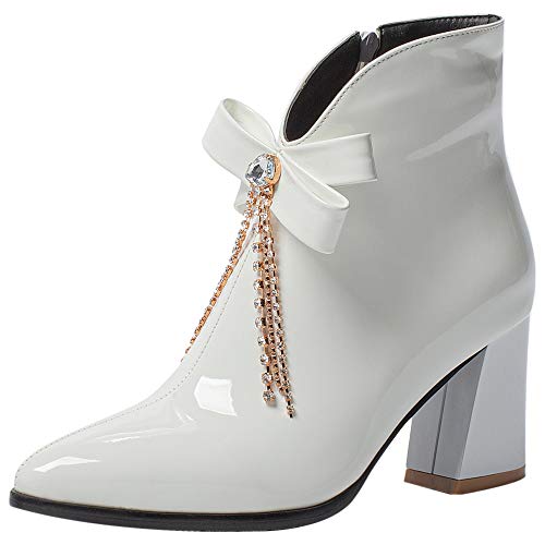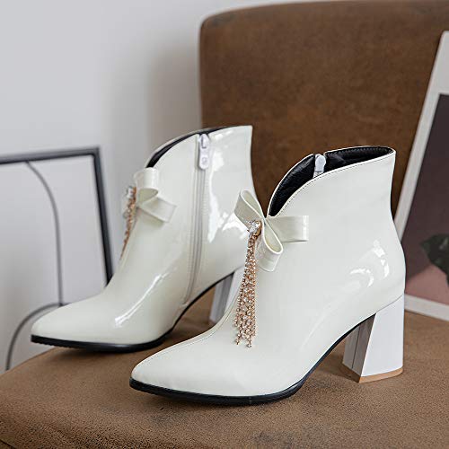 Mediffen Mujer Puntiagudo Botines Cremallera Tacón Ancho Boots con Lazos Mujer Tacón Alto Invierno Boots Warm Fiesta Boots Blanco-HM Talla 43 Asia