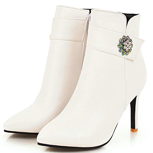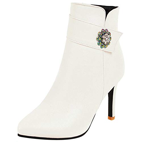 SUCREVEN Mujer Boda Boots Moda Strass Botines Tacón Alto Cremallera Vestido Boots con Hebilla Blanco-Hm Talla 31 EU