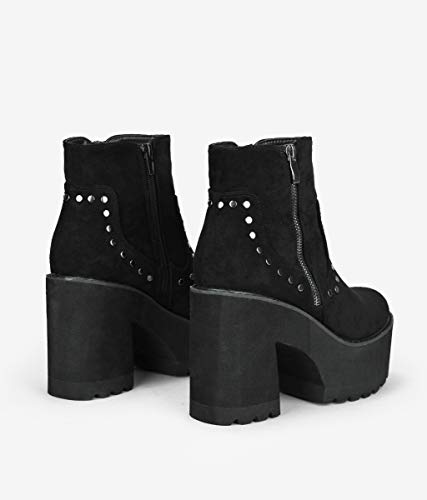 BOSANOVA Botines Negros con tacón y Plataforma con Detalle de tachas y Cremallera Exterior Decorativa. Suela de Volumen y Cierre con Cremallera Interior. Negro 39