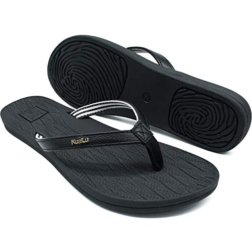 KuaiLu Chanclas Mujer Comodas Piel Verano Playa Piscina Ultraligera Sandalias de Dedo Planas Moda Caminar Antideslizante Yoga-Espuma Zapatillas Negro 37