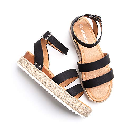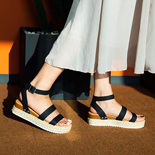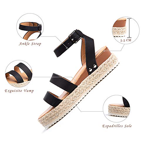 Sandalias Mujer Plataforma Esparto Verano Casual Alpargatas de Cuña Plateau Moda con Correa Tobillo 5 CM Negro B Talla 39 EU