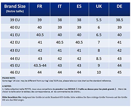 - Tabla de tallas:37 EU=37 tamaño ES,38 EU=38 tamaño ES,39 EU=39 tamaño ES,40 EU=40 tamaño ES,41 EU=41 tamaño ES,42 EU=42 tamaño ES