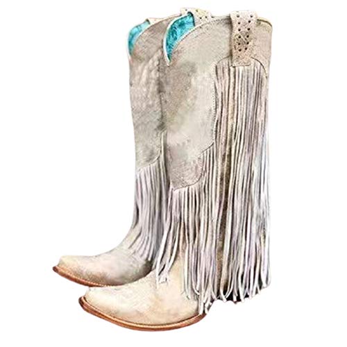 GBZLFH Botas de Mujer, Botas de Becerro de Vaquero con Flecos Retro, Botas de Caballero Cosidas a Mano con tacón Alto Grueso y Puntiagudo Resistente al Desgaste cálido,Blanco,38