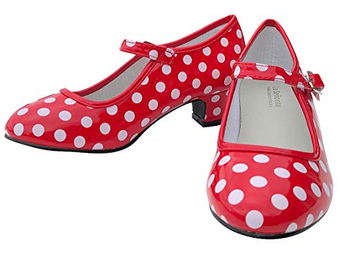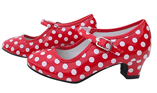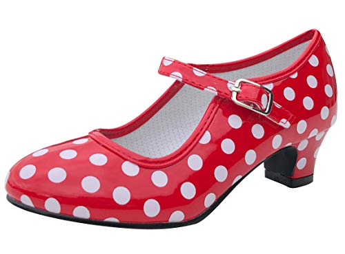 Zapato Flamenco, Calzado de Danza Baile Sevillanas para Niña Mujer, Rojo Lunares Negros (33, Negro)