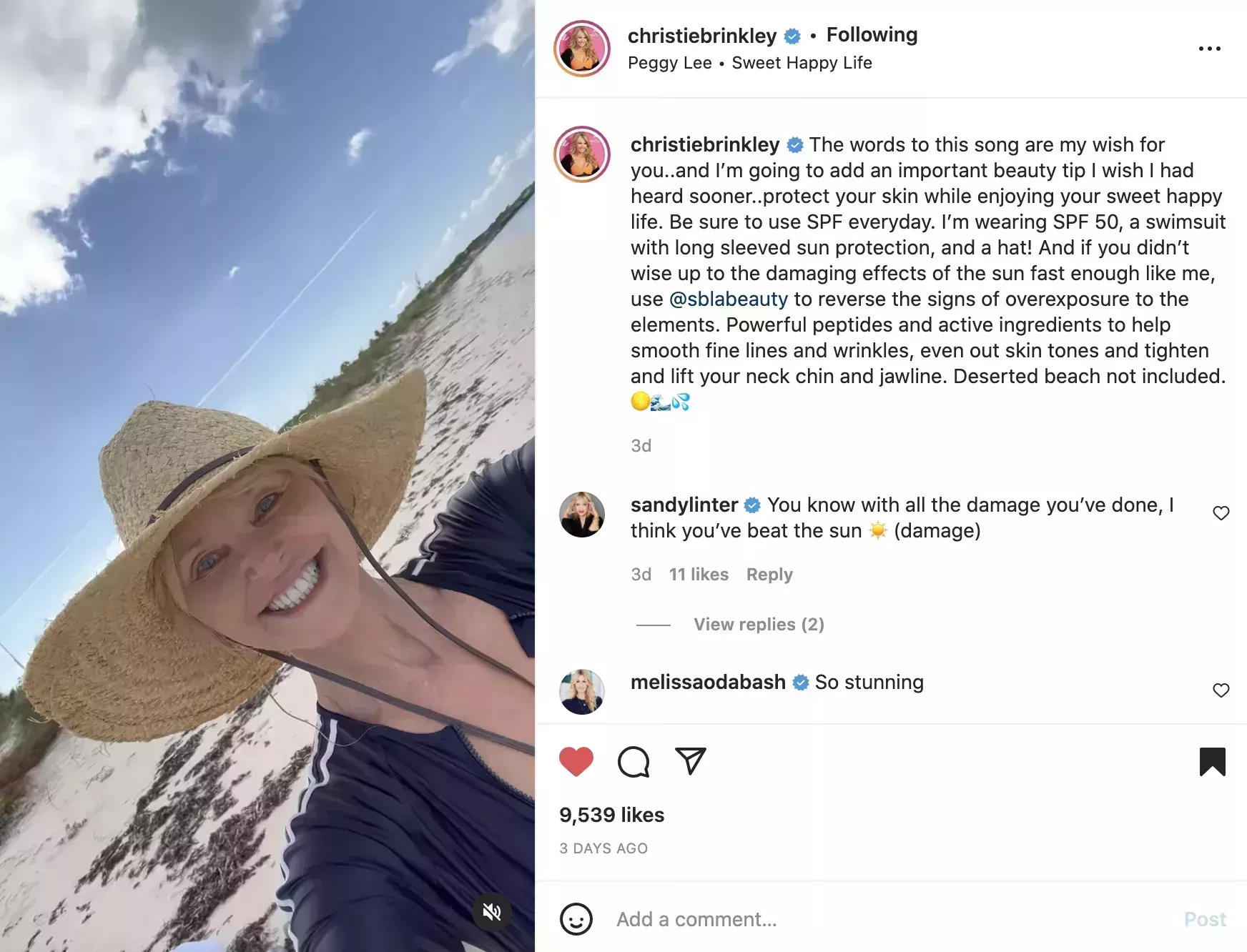 "La letra de esta canción es mi deseo para ti... y voy a añadir un importante consejo de belleza que desearía haber escuchado antes... protege tu piel mientras disfrutas de tu dulce vida feliz", escribió en el pie de foto. "Asegúrate de usar FPS todos los días. Estoy usando SPF 50, un traje de baño con protección solar de manga larga, ¡y un sombrero!".