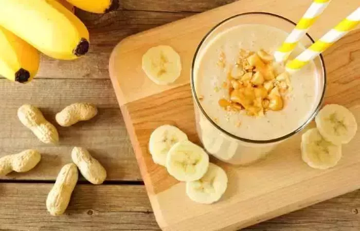 - Pon los plátanos, la leche, la mantequilla de cacahuete, la miel y los cubitos de hielo en una batidora.