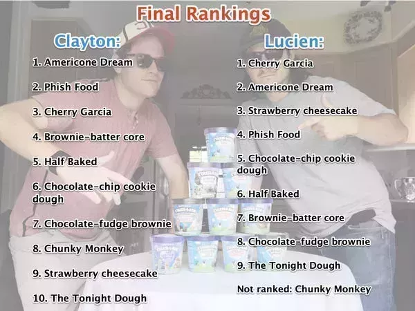 Yo, el experimentado probador Lucien Formichella, decidí revisar los 10 sabores más populares de la marca en 2020, pero sabía que era un trabajo demasiado grande para llevarlo a cabo yo solo. Necesitaba un Jerry para mi Ben - o mi amigo, Clayton James Smith.