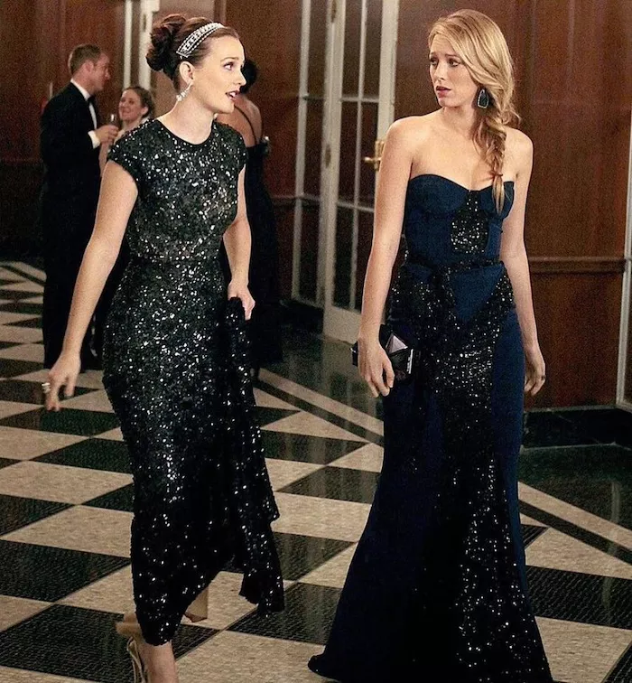 Blair no es ajena a los toques de color (más un toque de brillo). Si bien el rojo y el verde son, por supuesto, los típicos colores navideños, algunos de sus looks también incluyen girasoles sofisticados inesperados con negro, dorado y plateado. Haz que tus atuendos de temporada se destaquen al optar por metálicos o por un brillo total, como un vestido negro de lentejuelas. Agrega una capa de joyería dorada para dar mucho glamour.