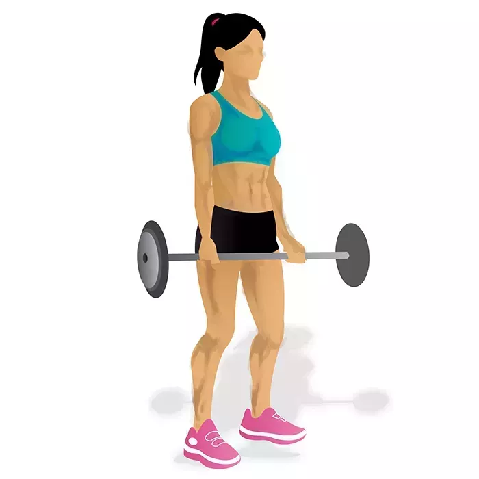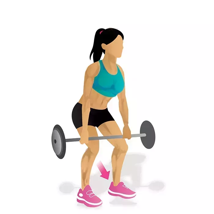 Posición inicial: Dobla las rodillas y la cintura para agarrar la barra pero mantén los talones siempre en el suelo. Utiliza un agarre por encima de los hombros y asegúrate de que tu espalda está lo más recta posible durante todo el proceso.