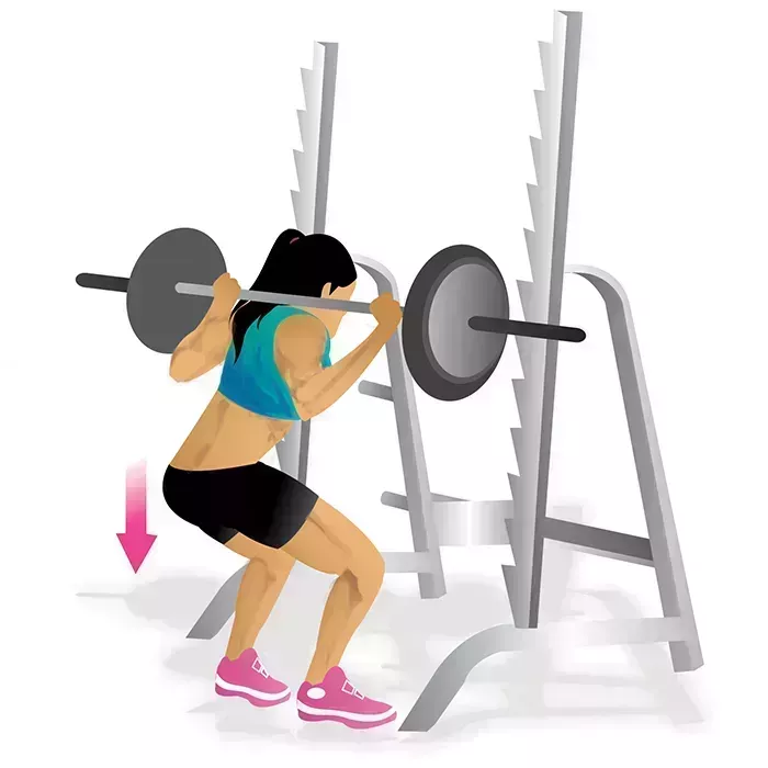 Posición inicial: Coloque una barra en la parte posterior de los hombros. Ponte de pie y detrás de un banco plano o cualquier otro obstáculo que no sea demasiado alto para pisar.