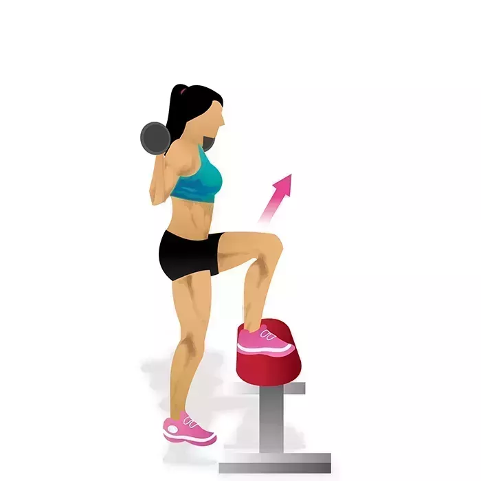 - Coloca el pie izquierdo en el banco plano y deja que el pie derecho se acerque lentamente hasta colocarlo al lado del pie izquierdo.