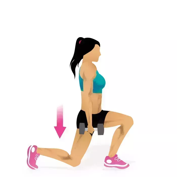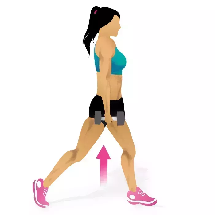 - Da un paso adelante con una pierna hasta que la espinilla y el muslo formen un ángulo de 90 grados (inhala durante este movimiento)