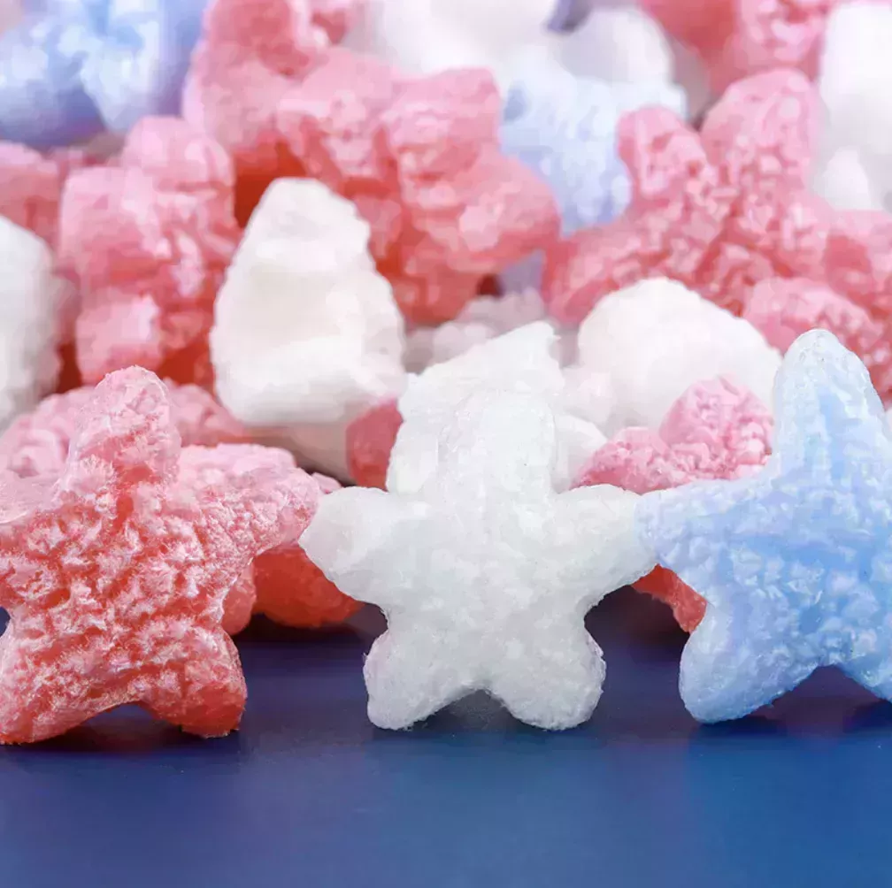 En lugar de los cacahuetes tradicionales, fabricados con espuma de poliestireno no biodegradable, llenamos las bolsas Steele con cacahuetes en forma de estrella fabricados con almidón biodegradable que incluso se derrite en el agua. ¿Mejor para el medio ambiente y más bonito? Todos salimos ganando.
