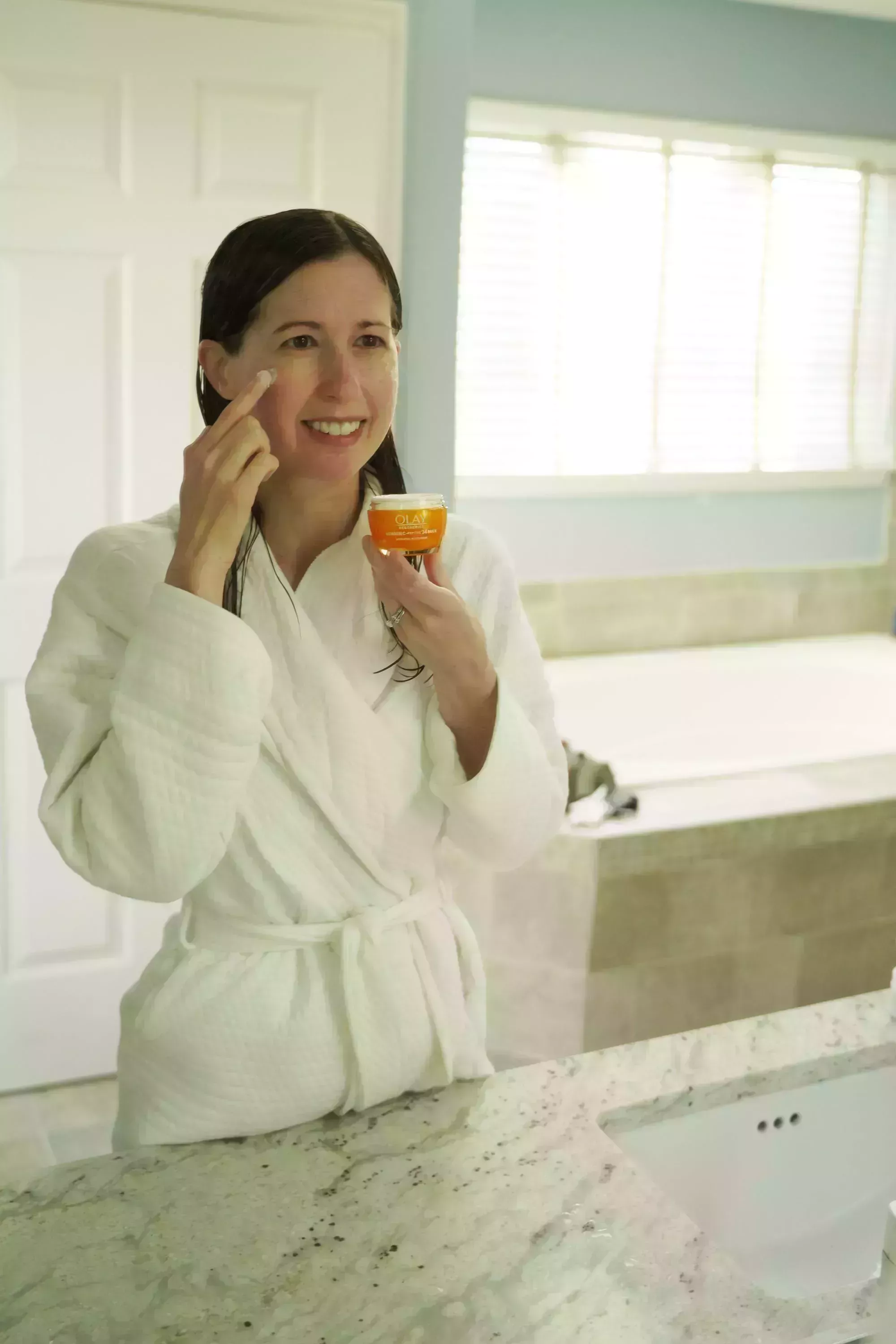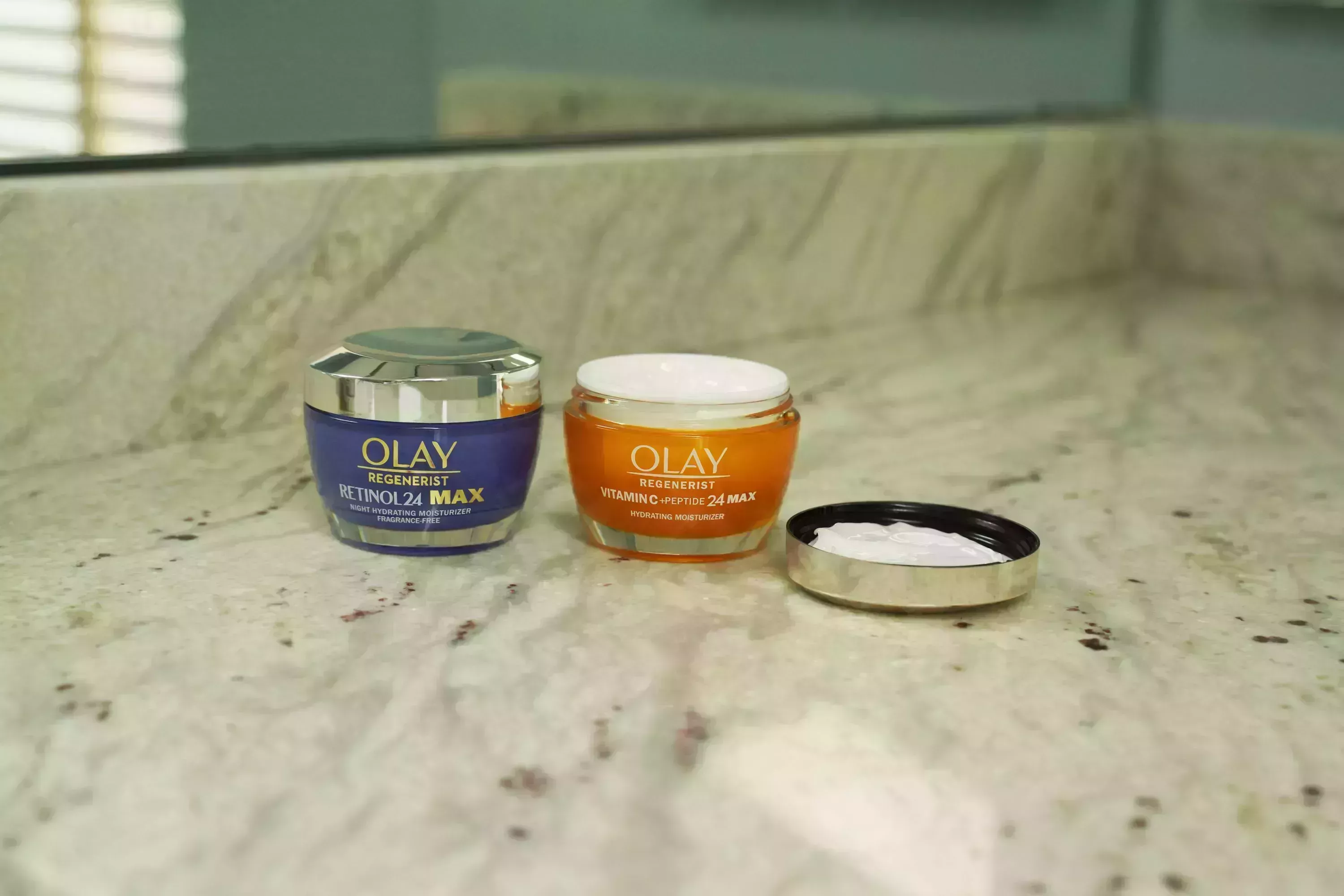 Se limpia la cara y sigue con la aplicación de un sérum hidratante y la crema hidratante facial Olay Regenerist Vitamin C + Peptide 24 MAX. Con vitamina C, péptidos y niacinamida, la fórmula mejora visiblemente las arrugas, ilumina y unifica la piel, y proporciona una hidratación de 24 horas (ideal para las zonas escamadas). "Hace que mi piel se sienta suave y tersa durante todo el día y me gusta su sutil aroma", dice.