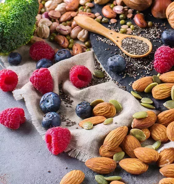 Los alimentos ricos en fibra insoluble son Alimentos integrales (arroz integral, cuscús, quinoa, etc.), tubérculos, bayas con semillas, legumbres, lentejas, frutos secos y semillas.
