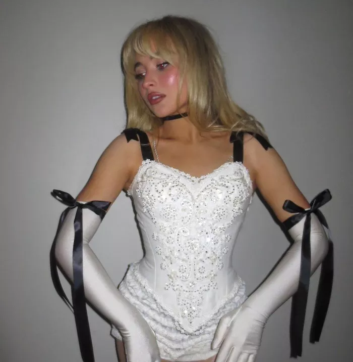 Cómo conseguir su look: Para un glamur aprobado por Sabrina Carpenter, combina un top corset negro con una mini de seda, medias opacas y Mary Janes o botines de plataforma. Para un ambiente más casual, cambia la mini por jeans de piernas anchas. ¡No olvides el lazo en tu cabello y tu look será todo menos tonterías!