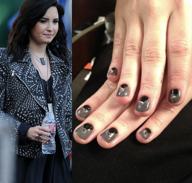 Como ya os decíamos, Demi Lovato ha sido una de las primeras celebrities en lucir la manicura rockera, y la ha llevado combinada con un esmalte gris al programa de Jimmy Kimmel en donde acudió para una entrevista y para actual en directo, en donde presentó Heart Attack, una canción de su último trabajo, Demi.