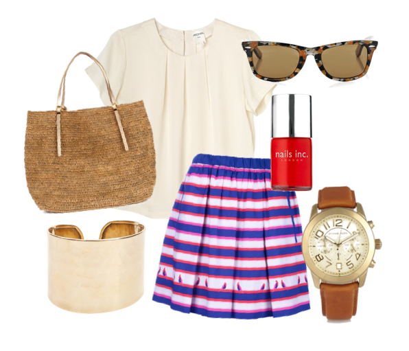 Un top blanco en un tejido que resulte fresco como la seda, combinado con una falda con colores como azul, coral o blanco (la que te proponemos es de Marc by Marc Jacobs) y con accesorios veraniegos como un bolso de rafia (este es de Michael Kors) y unas gafas de sol (estas son Rayban).