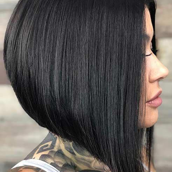 El bob de la línea A es un corte versátil que se puede adaptar a todos los estilos. Para aquellos que quieren hacer una declaración de estilo llamativa, un bob de línea A de ángulo más agudo, sin capas, es una excelente elección. El corte se ve mejor cuando se hace con un estilo suave y elegante y también se ve muy bien con un color de cabello sólido como el negro o el rubio platino.