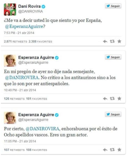 "¿Me va a decir usted lo que yo siento por España, @EzperanzaAguirre?" decía Rovira tras escuchar el pregón que Esperanza dio en Sevilla en el que, básicamente, llamó a los antitaurinos, antiespañoles: "saben que los toros simbolizan la esencia del ser español y porque en su afán por acabar con España quieren prohibir los toros por decreto”. A lo que el actor de Ocho Apellidos Vascos no se pudo callar.