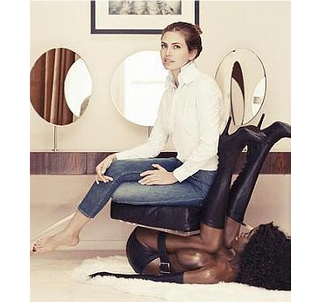 Vemos a Dasha Zhukova, novia de Roman Abramovich, sentada en una silla-escultura que tiene a una mujer negra como base. Dasha es una aficionada al mundo de la moda y al diseño, pero, sinceramente, creemos que la chica a la hora de comprar esta escultura tuvo poco ojo, o, por lo menos, poco tacto. Poquísimo, más bien. No es sólo es humillante que la imagen de una mujer sea utilizada para ser la base de un asiento, sino que esta además esté casi desnuda y sea negra, lo que ha hecho que todas las voces tachándola de racista se alcen.