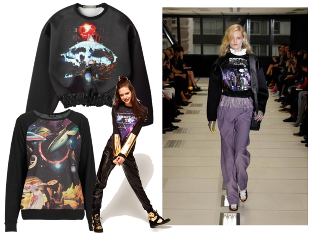 La primera (la de la izquierda) es de Topshop y su precio es 36 euros. Planetas, naves y galaxias desconocidas, los británicos se ponen en plan intergaláctico con esta sudadera en la que echamos de menos algo de letras como sí había en las de la marca francesa.