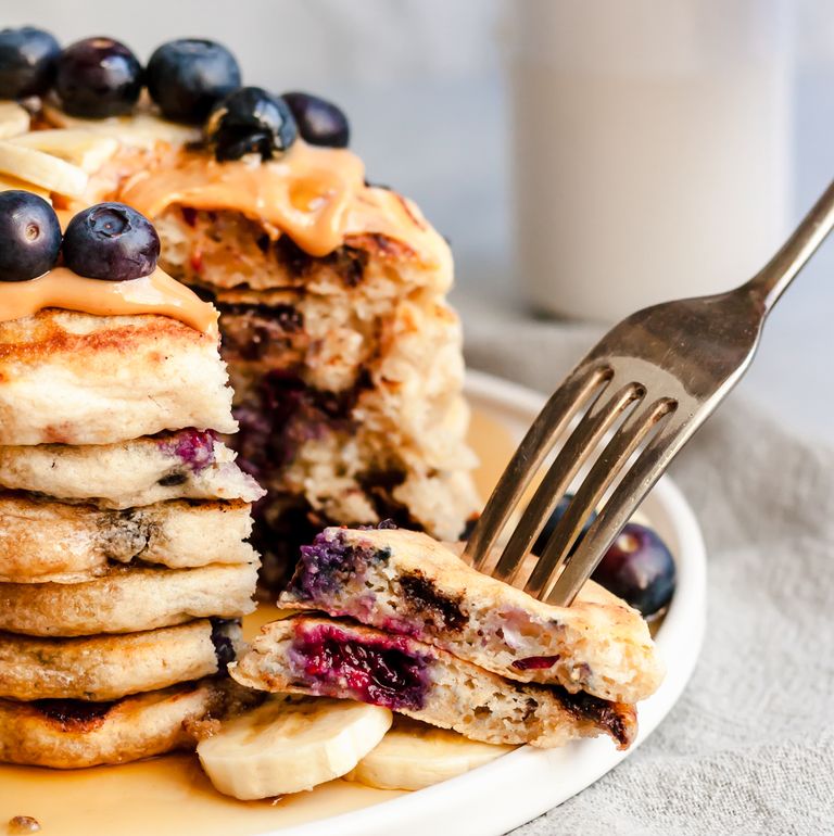 No se necesitan huevos para estos panqueques ligeros, esponjosos y rellenos de arándanos. Cubra con mantequilla de nueces para obtener más proteínas y grasas saludables.