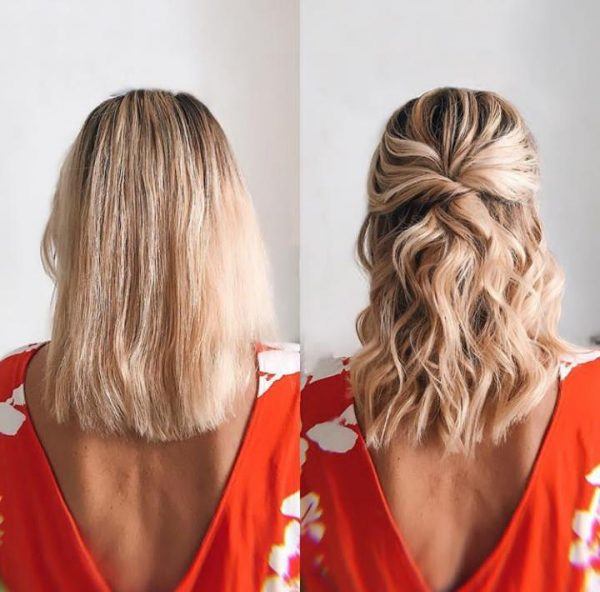¿Qué tan perfecta es esta simple transformación? Las chicas de baja estatura pueden elegir entre mantener el pelo liso o añadir ondas y rizos sueltos. Un simple recogido de medio pelo con giros y nudos puede hacerse tanto en el pelo corto como en el largo. Este estilo es genial para un día casual y puede ser peinado con cuentas y clips para un look formal.