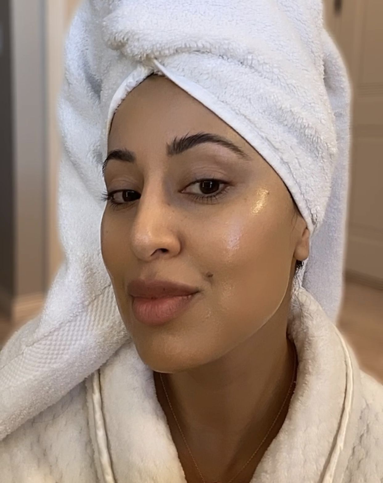 Por la noche, suele utilizar un limpiador exfoliante."Por lo general, utilizo Cerave Foaming Facial Cleanser por la noche para desmaquillarme", dice. "Lo alterno con un lavado de ácido glicólico. El ácido glicólico es mi recurso cuando mi piel se siente y se ve apagada y necesita un refresco, porque el ácido alfa-hidróxido en el limpiador hace un buen trabajo exfoliando mi piel."
