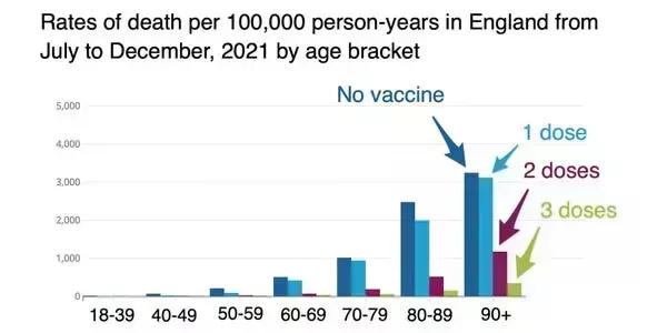 Tres dosis redujeron el riesgo para los mayores de 90 años en aproximadamente un 93%, haciendo que el riesgo fuera menor que el de una persona de 60 años no vacunada. Con dos dosis, el riesgo era aproximadamente el mismo que el de una persona de 70 años no vacunada.