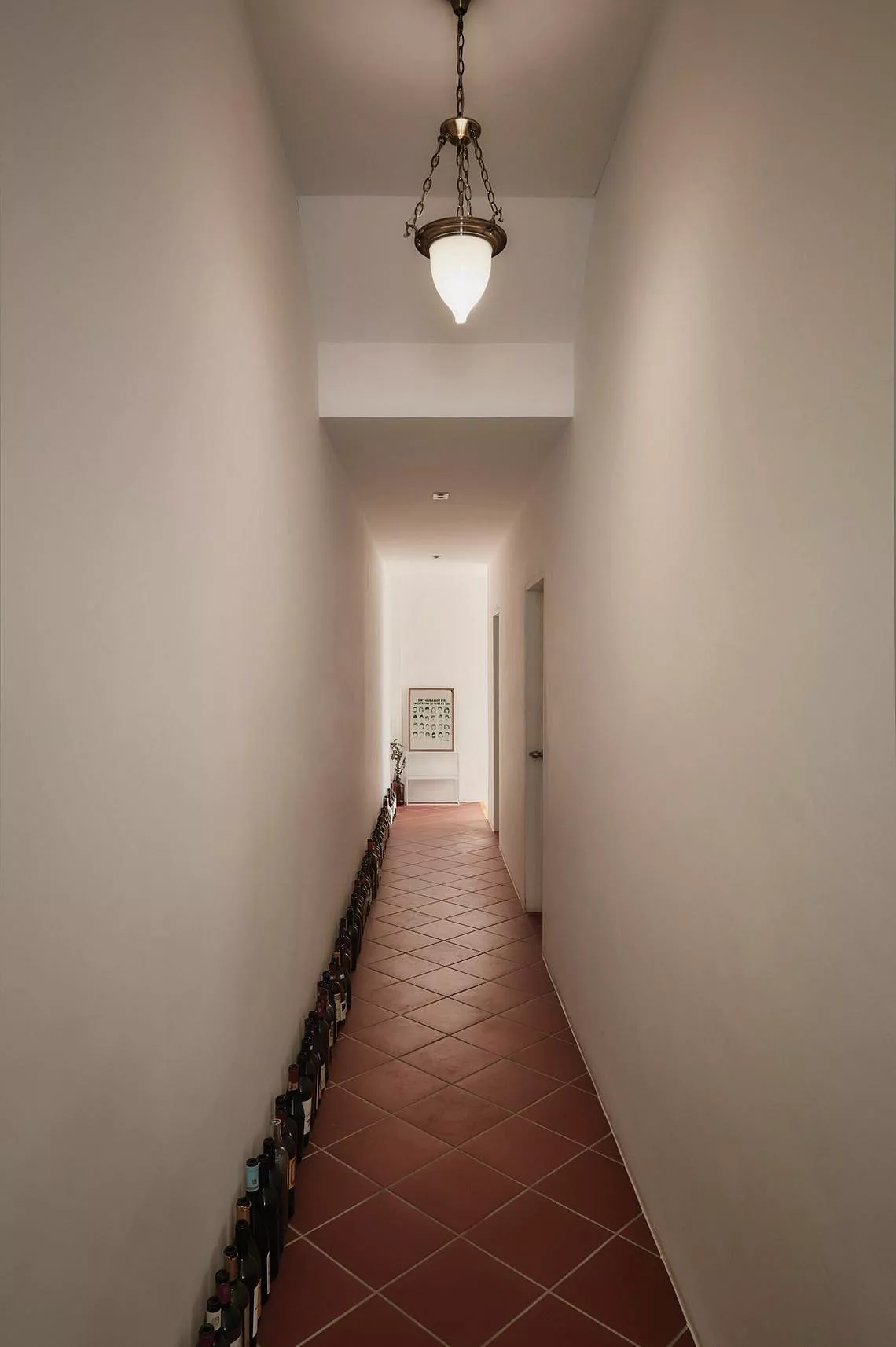 El pasillo central de la unidad está decorado con botellas de vino vacías para ambientar. Hay un largo pasillo que conduce a los dormitorios, dos baños y la cocina. La pareja lo decoró con botellas de vino vacías para agregar al ambiente. Como la cocina está algo alejada de las áreas de estar y comedor, los huéspedes disfrutan de privacidad mientras cenan.